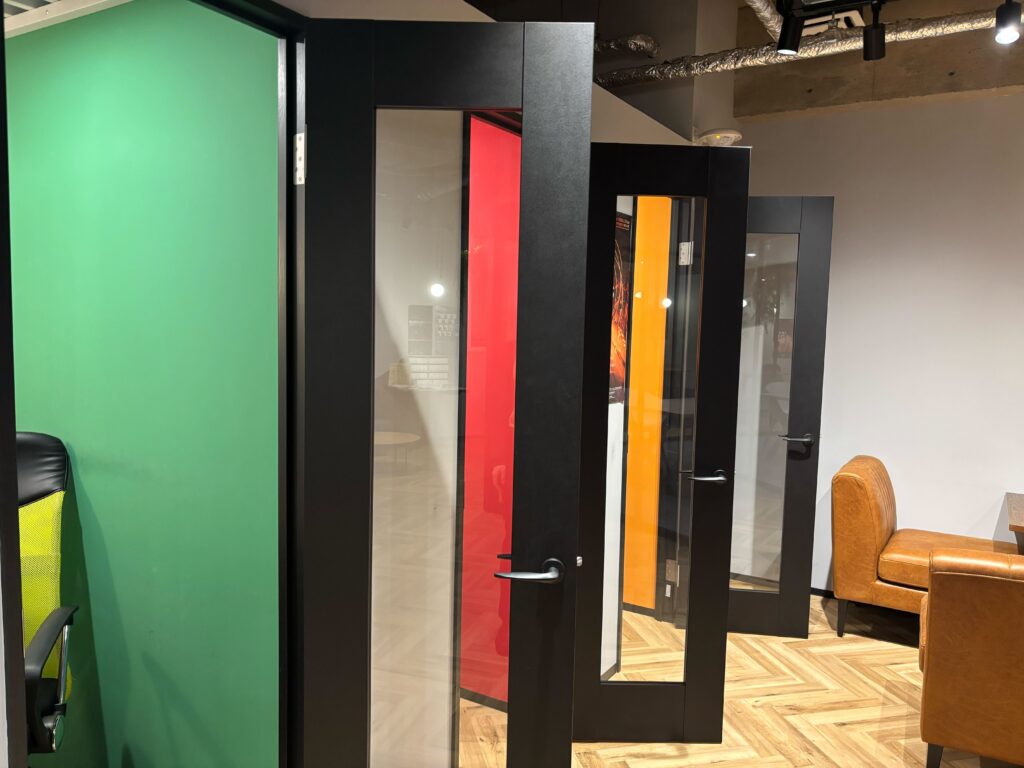 サラボには、緑・赤・オレンジのカラフルな個室オンラインブースが3つあります。
