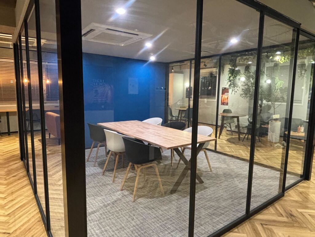 サラボの中心には、鏡張りで開放感のあるミーティングルームがあります。